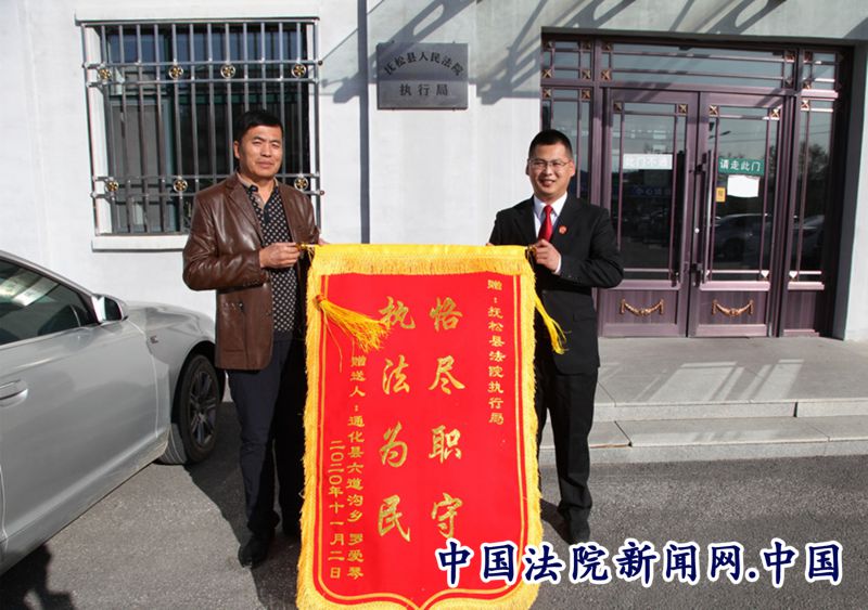 法院讯(乔元兀)近日,家住通化县六道沟乡申请执行人罗某将一面写有“恪尽职守,执法为民”字样的鲜红锦旗送到了抚松县人民法院执行局,表达对执行法官不辞辛苦、亲历亲为办案,依法将拖欠自己多年的借款执行回来,感激之情在北国冰雪时节让人格外暖心。